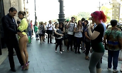 Fascinating cfnm femdoms tugging sub in group