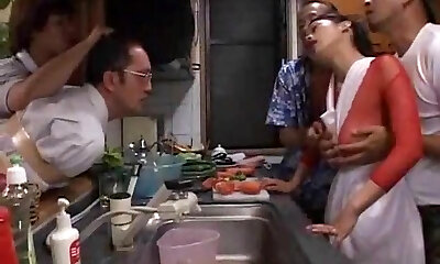 Hot gangbang in a classic japanese restaurant fucking hot milf