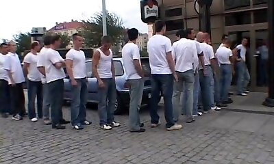 Slutty brunette fucked hard by 30 men in this gang-fuck film