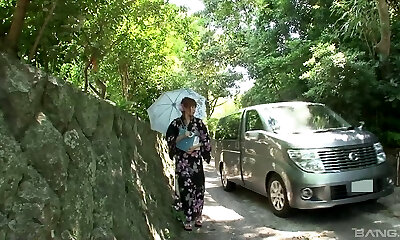 Kimono girl in a van sucks lollipop and gets fucktoy fucked
