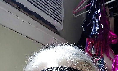 Mature dame using egg vibrator, masturbating cutting panties with scissors